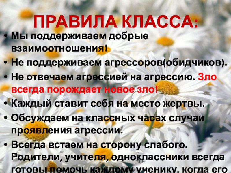 Всегда встаем на сторону слабого. Родители, учителя, одноклассники всегда готовы помочь каждому ученику, когда его обижают.