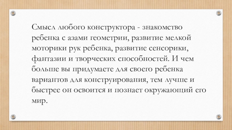 Слайд 30Смысл любого конструктора - знакомство ребенка с азами геометрии, развитие мелкой