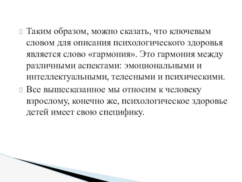 В целом можно сделать вывод, что психологическое здоровье формируется при взаимодействии внутренних и внешних факторов. Основным условием нормального психосоциального развития (помимо здоровой нервной системы) признается спокойная и доброжелательная обстановка, создаваемая благодаря постоянному присутствию родителей или воспитателей, которые внимательно относятся к эмоциональным потребностям ребенка, беседуют и играют с ним, поддерживают дисциплину, осуществляют необходимое наблюдение за ребенком. Следует предоставлять ребенку больше самостоятельности и независимости.