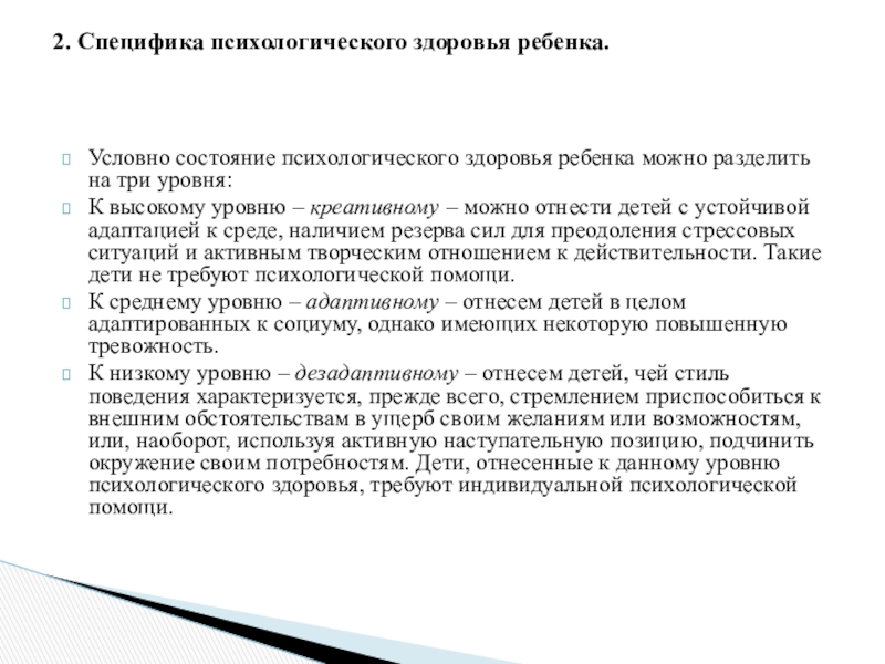 Учет индивидуальных особенностей ребенка при построении работы, особенно оздоровительной, создаст благоприятную почву для эффективного созидания психологического комфорта и формирования психологического здоровья каждого конкретного ребенка.