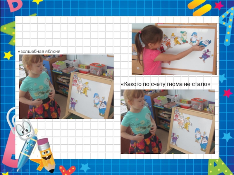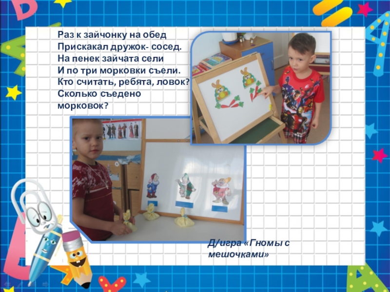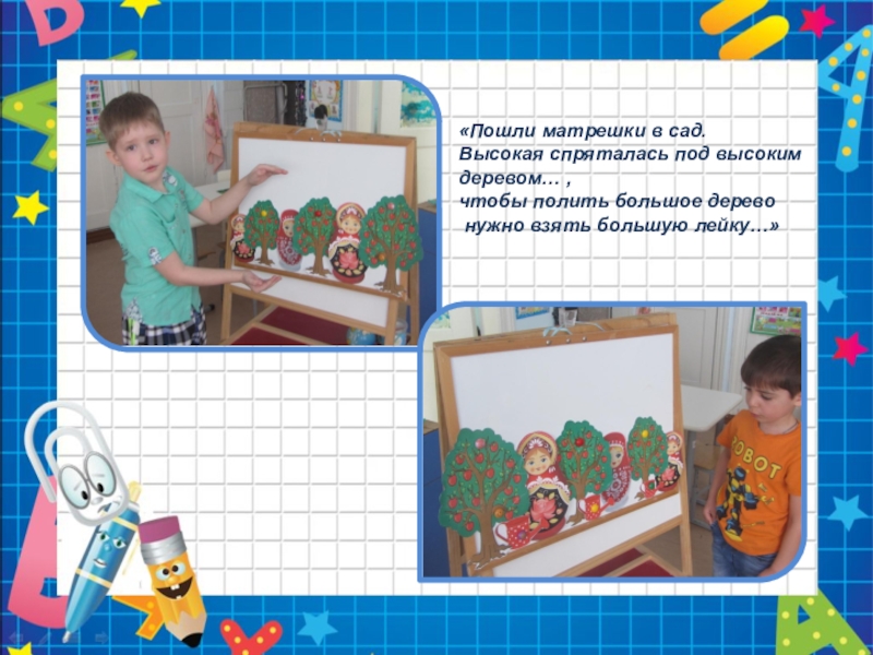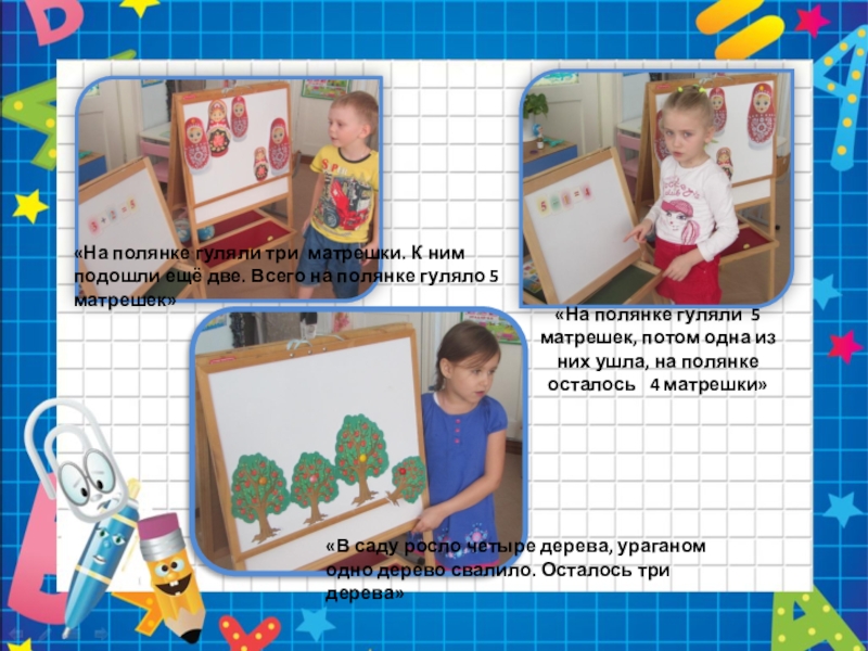 «На полянке гуляли 5 матрешек, потом одна из них ушла, на полянке осталось 4 матрешки»