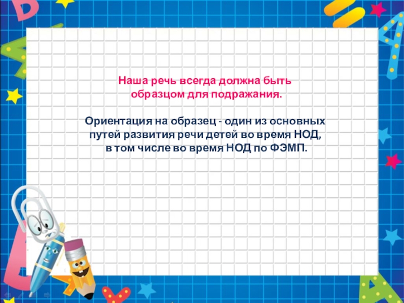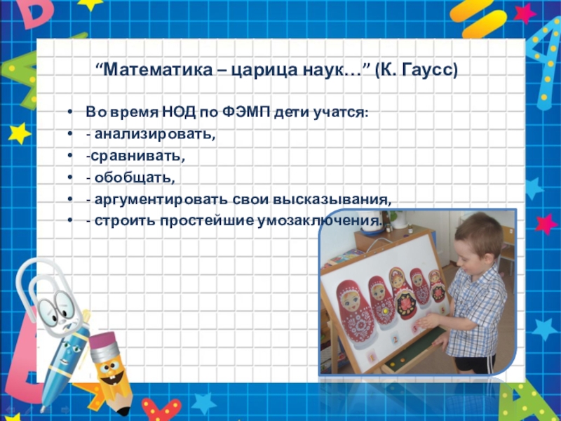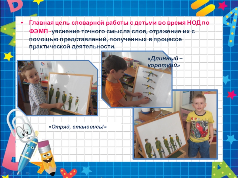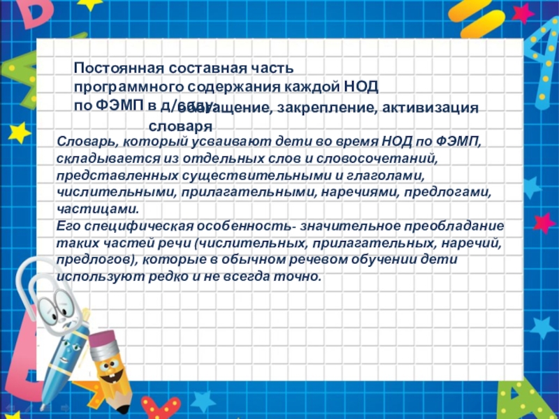 Словарь, который усваивают дети во время НОД по ФЭМП, складывается из отдельных слов и словосочетаний, представленных существительными и глаголами, числительными, прилагательными, наречиями, предлогами, частицами.