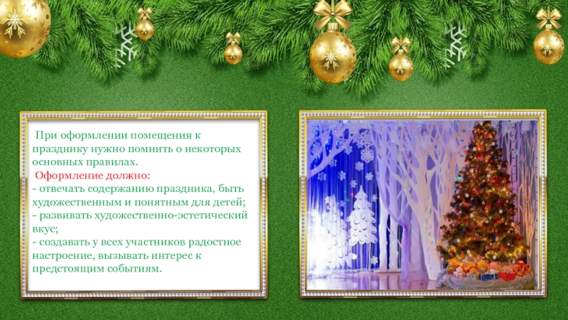 Слайд 8 При оформлении помещения к празднику нужно помнить о некоторых основных правилах.