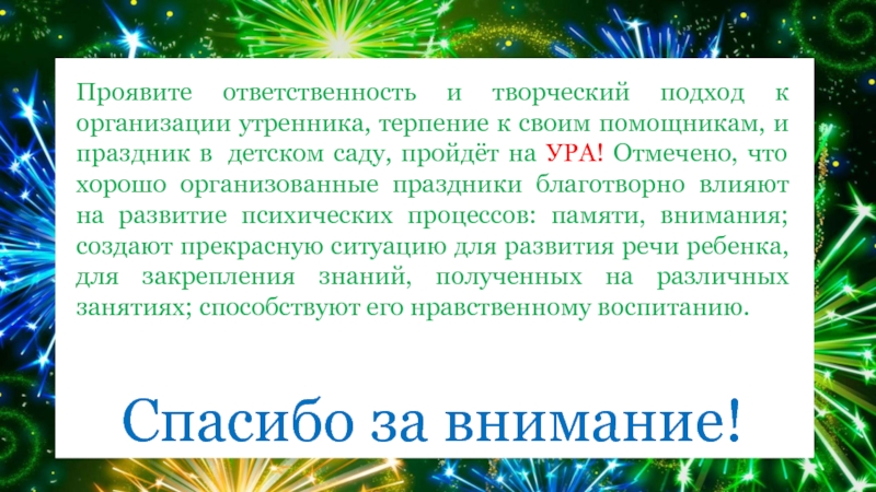 Слайд 28Проявите ответственность и творческий подход к организации утренника, терпение к своим