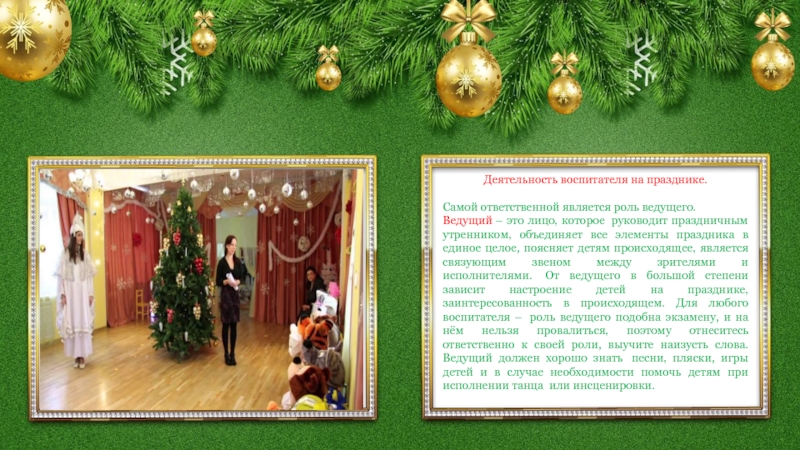 праздничным утренником, объединяет все элементы праздника в единое целое, поясняет детям происходящее, является связующим звеном между зрителями и исполнителями. От ведущего в большой степени зависит настроение детей на празднике, заинтересованность в происходящем. Для любого воспитателя – роль ведущего подобна экзамену, и на нём нельзя провалиться, поэтому отнеситесь ответственно к своей роли, выучите наизусть слова. Ведущий должен хорошо знать песни, пляски, игры детей и в случае необходимости помочь детям при исполнении танца или инсценировки.