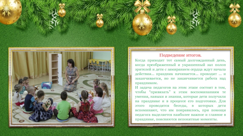Воспитателю необходимо помнить, что подготовка к празднику, сам праздник и после праздничные дни — это звенья одной неразрывной цепи.
