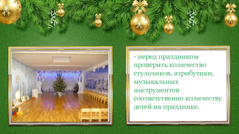 Слайд 19- перед праздником проверить количество стульчиков, атрибутики, музыкальных инструментов соответственно количеству
