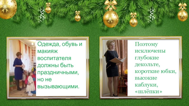 Слайд 10Одежда, обувь и макияж воспитателя должны быть праздничными, но не вызывающими.