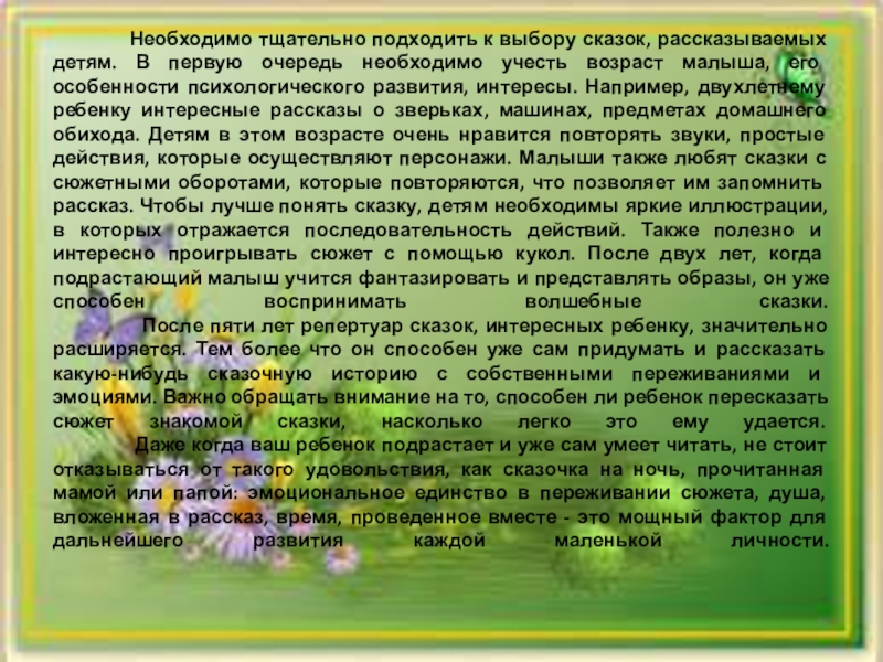 выбору сказок, рассказываемых детям. В первую очередь необходимо учесть возраст малыша, его особенности психологического развития, интересы. Например, двухлетнему ребенку интересные рассказы о зверьках, машинах, предметах домашнего обихода. Детям в этом возрасте очень нравится повторять звуки, простые действия, которые осуществляют персонажи. Малыши также любят сказки с сюжетными оборотами, которые повторяются, что позволяет им запомнить рассказ. Чтобы лучше понять сказку, детям необходимы яркие иллюстрации, в которых отражается последовательность действий. Также полезно и интересно проигрывать сюжет с помощью кукол. После двух лет, когда подрастающий малыш учится фантазировать и представлять образы, он уже способен воспринимать волшебные сказки.