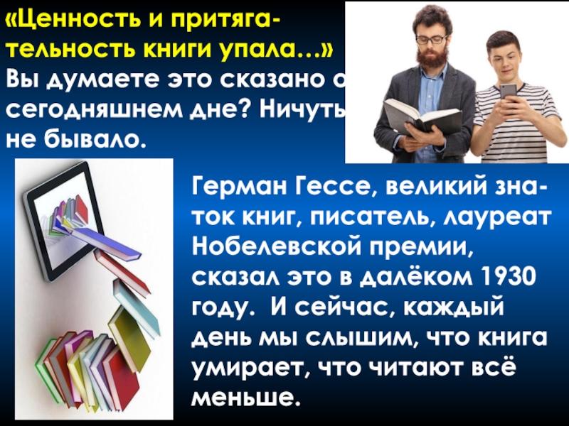 Герман Гессе, великий зна-ток книг, писатель, лауреат Нобелевской премии, сказал это в далёком 1930 году. И сейчас, каждый день мы слышим, что книга умирает, что читают всё меньше.