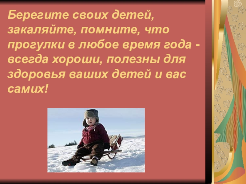 Слайд 5Берегите своих детей, закаляйте, помните, что прогулки в любое время года