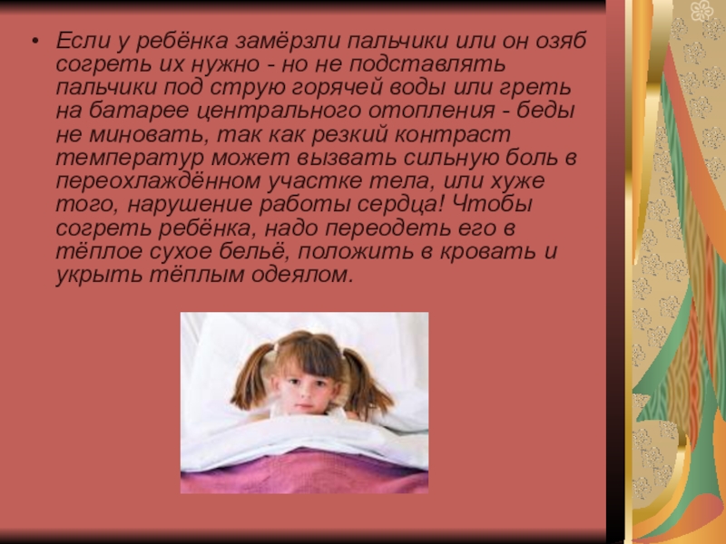 - но не подставлять пальчики под струю горячей воды или греть на батарее центрального отопления - беды не миновать, так как резкий контраст температур может вызвать сильную боль в переохлаждённом участке тела, или хуже того, нарушение работы сердца! Чтобы согреть ребёнка, надо переодеть его в тёплое сухое бельё, положить в кровать и укрыть тёплым одеялом.