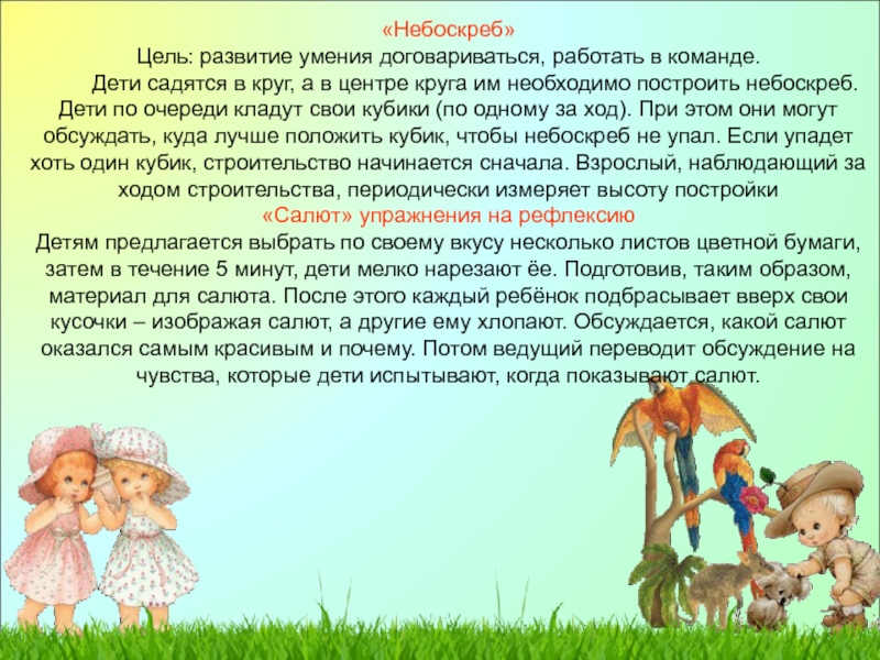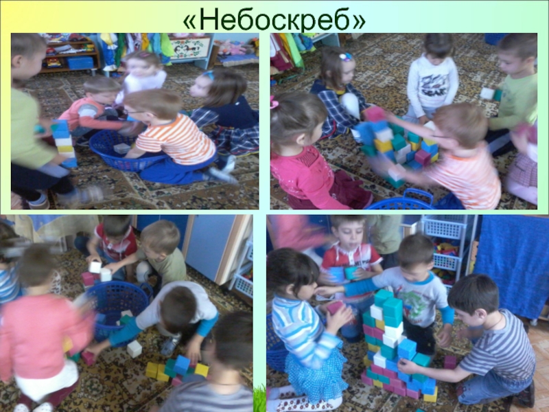 Дети садятся в круг, а в центре круга им необходимо построить небоскреб. Дети по очереди кладут свои кубики (по одному за ход). При этом они могут обсуждать, куда лучше положить кубик, чтобы небоскреб не упал. Если упадет хоть один кубик, строительство начинается сначала. Взрослый, наблюдающий за ходом строительства, периодически измеряет высоту постройки