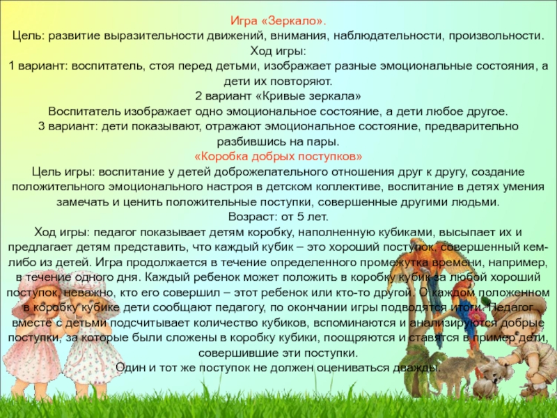 Ход игры: педагог показывает детям коробку, наполненную кубиками, высыпает их и предлагает детям представить, что каждый кубик – это хороший поступок, совершенный кем-либо из детей. Игра продолжается в течение определенного промежутка времени, например, в течение одного дня. Каждый ребенок может положить в коробку кубик за любой хороший поступок, неважно, кто его совершил – этот ребенок или кто-то другой. О каждом положенном в коробку кубике дети сообщают педагогу, по окончании игры подводятся итоги. Педагог вместе с детьми подсчитывает количество кубиков, вспоминаются и анализируются добрые поступки, за которые были сложены в коробку кубики, поощряются и ставятся в пример дети, совершившие эти поступки.
