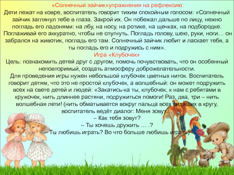 голосом: «Солнечный зайчик заглянул тебе в глаза. Закрой их. Он побежал дальше по лицу, нежно погладь его ладонями: на лбу, на носу, на ротике, на щечках, на подбородке. Поглаживай его аккуратно, чтобы не спугнуть. Погладь голову, шею, руки, ноги… он забрался на животик, погладь его там. Солнечный зайчик любит и ласкает тебя, а ты погладь его и подружись с ним».
