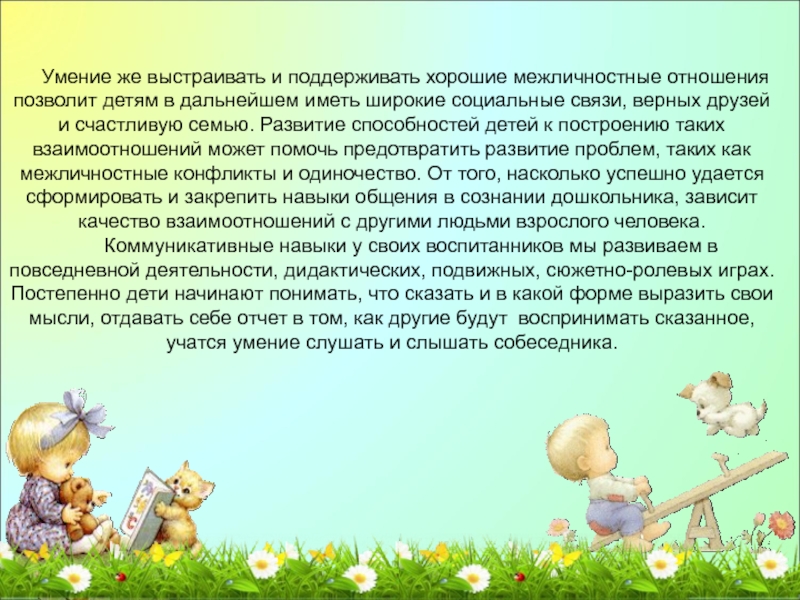 позволит детям в дальнейшем иметь широкие социальные связи, верных друзей и счастливую семью. Развитие способностей детей к построению таких взаимоотношений может помочь предотвратить развитие проблем, таких как межличностные конфликты и одиночество. От того, насколько успешно удается сформировать и закрепить навыки общения в сознании дошкольника, зависит качество взаимоотношений с другими людьми взрослого человека.