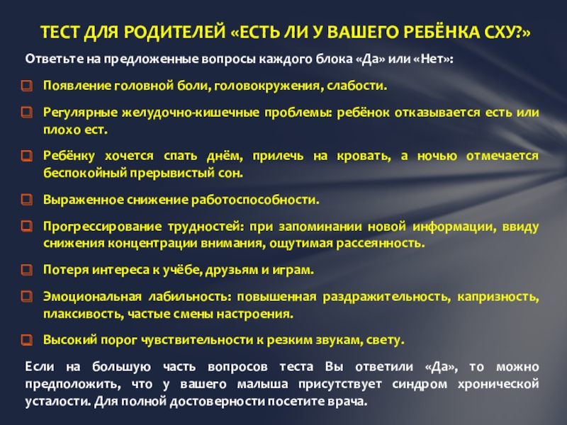 ТЕСТ ДЛЯ РОДИТЕЛЕЙ «ЕСТЬ ЛИ У ВАШЕГО РЕБЁНКА СХУ?»