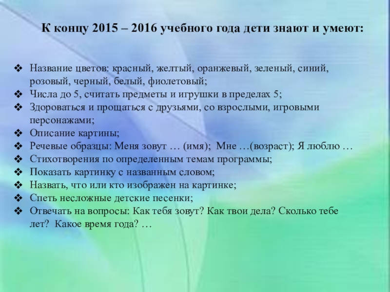 Отвечать на вопросы: Как тебя зовут? Как твои дела? Сколько тебе лет? Какое время года? …
