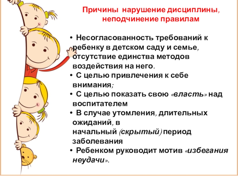 Слайд 7Причины нарушение дисциплины, неподчинение правилам