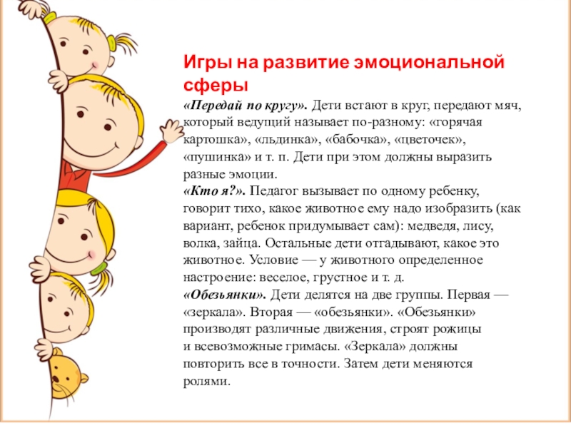 называет по-разному: «горячая картошка», «льдинка», «бабочка», «цветочек», «пушинка» и т. п. Дети при этом должны выразить разные эмоции.