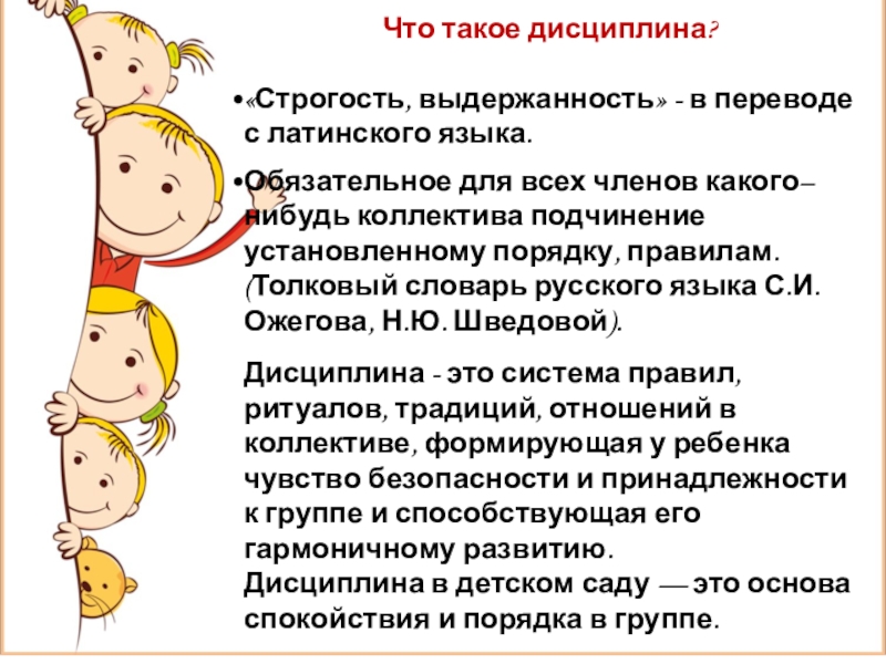 Дисциплина - это система правил, ритуалов, традиций, отношений в коллективе, формирующая у ребенка чувство безопасности и принадлежности к группе и способствующая его гармоничному развитию.