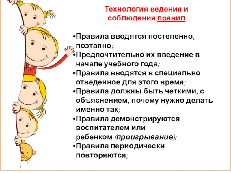 Правила демонстрируются воспитателем или ребенком (проигрывание);