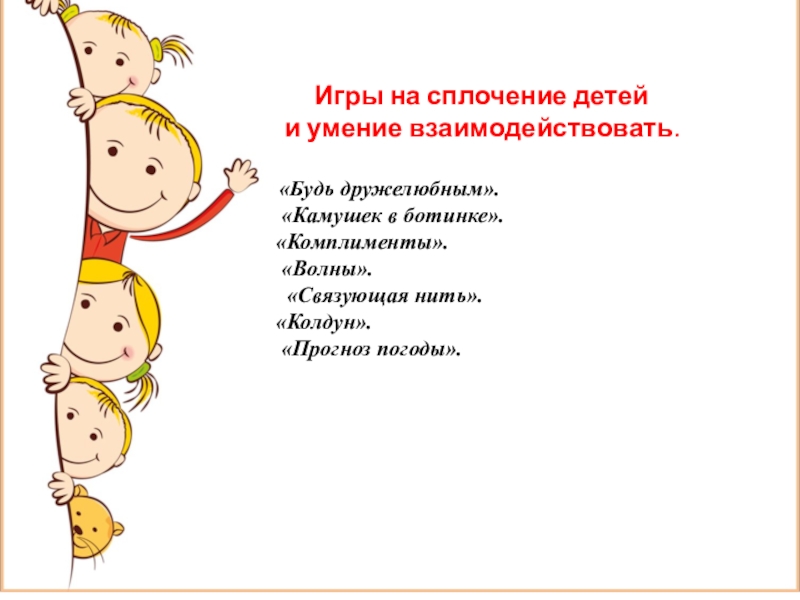 Слайд 11Игры на сплочение детей и умение взаимодействовать.