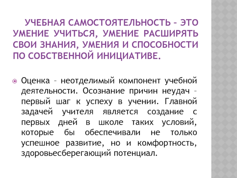 Оценка – неотделимый компонент учебной деятельности. Осознание причин неудач – первый шаг к успеху в учении. Главной задачей учителя является создание с первых дней в школе таких условий, которые бы обеспечивали не только успешное развитие, но и комфортность, здоровьесберегающий потенциал.