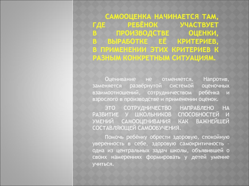 ЭТО СОТРУДНИЧЕСТВО НАПРАВЛЕНО НА РАЗВИТИЕ У ШКОЛЬНИКОВ СПОСОБНОСТЕЙ И УМЕНИЙ САМООЦЕНИВАНИЯ КАК ВАЖНЕЙШЕЙ СОСТАВЛЯЮЩЕЙ САМООБУЧЕНИЯ.