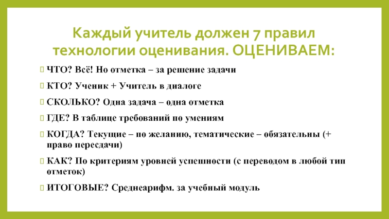 Слайд 4Каждый учитель должен 7 правил технологии оценивания. ОЦЕНИВАЕМ: