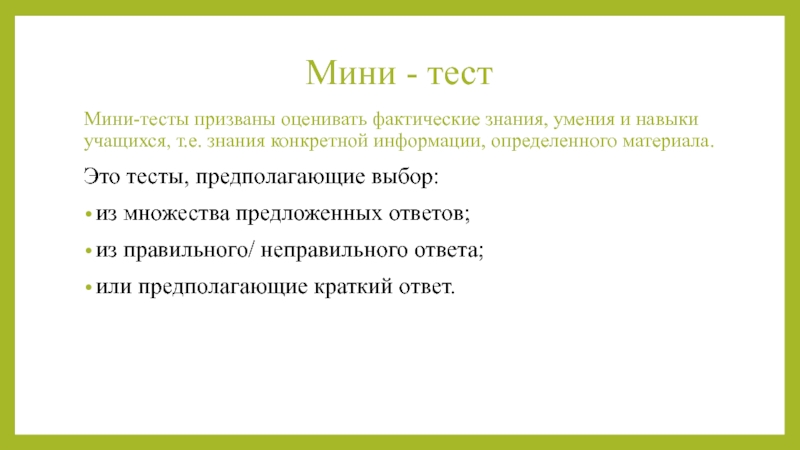 Мини-тесты призваны оценивать фактические знания, умения и навыки учащихся,