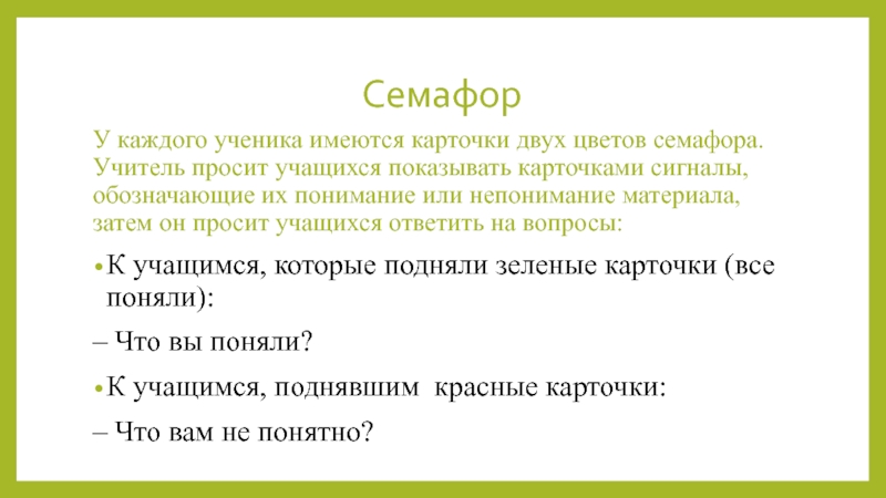 показывать карточками сигналы, обозначающие их понимание или непонимание материала, затем он просит учащихся ответить на вопросы: