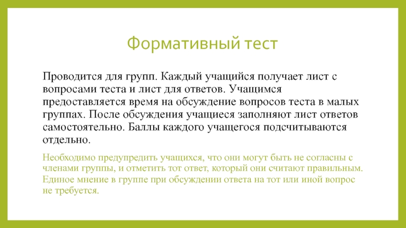и лист для ответов. Учащимся предоставляется время на обсуждение вопросов теста в малых группах. После обсуждения учащиеся заполняют лист ответов самостоятельно. Баллы каждого учащегося подсчитываются отдельно.