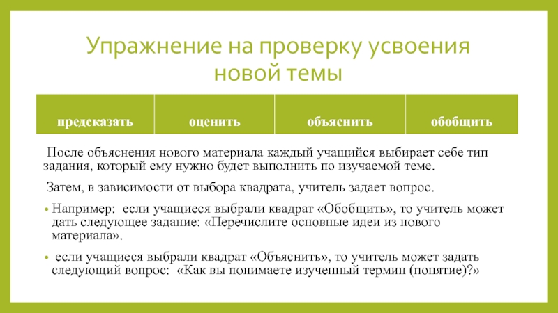 если учащиеся выбрали квадрат «Объяснить», то учитель может задать следующий вопрос: «Как вы понимаете изученный термин (понятие)?»