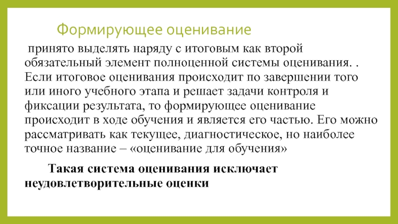 полноценной системы оценивания. . Если итоговое оценивания происходит по завершении того или иного учебного этапа и решает задачи контроля и фиксации результата, то формирующее оценивание происходит в ходе обучения и является его частью. Его можно рассматривать как текущее, диагностическое, но наиболее точное название – «оценивание для обучения»