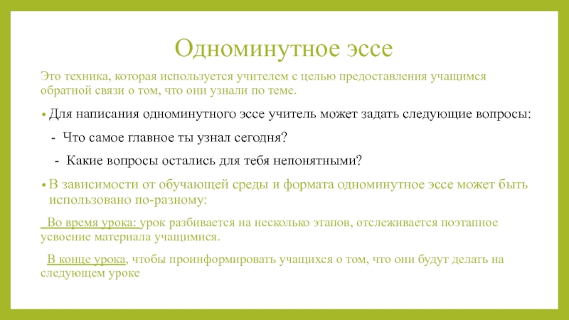 В зависимости от обучающей среды и формата одноминутное эссе может быть использовано по-разному: