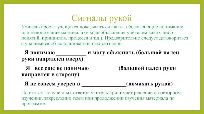 (в ходе объяснения учителем каких-либо понятий, принципов, процесса и т.д.). Предварительно следует договориться с учащимися об использовании этих сигналов: