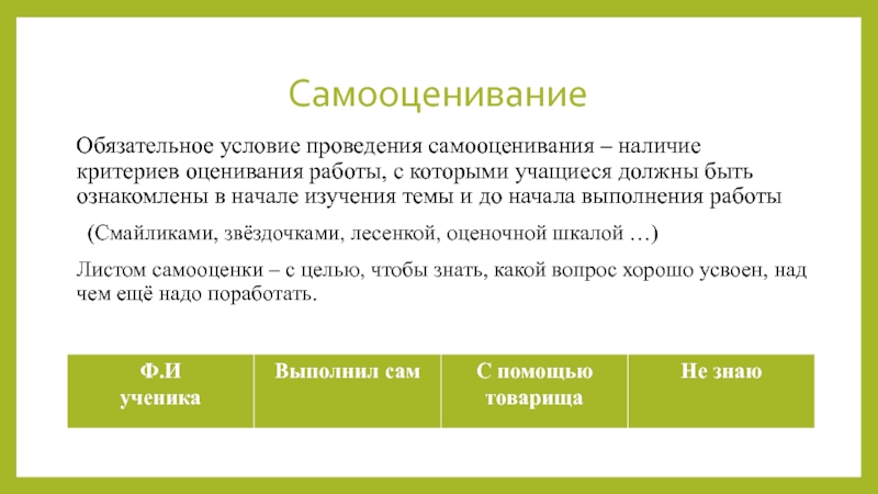 Обязательное условие проведения самооценивания – наличие критериев оценивания работы, с которыми