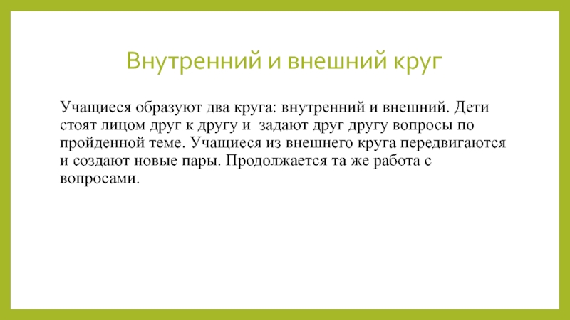 стоят лицом друг к другу и задают друг другу вопросы по пройденной теме. Учащиеся из внешнего круга передвигаются и создают новые пары. Продолжается та же работа с вопросами.
