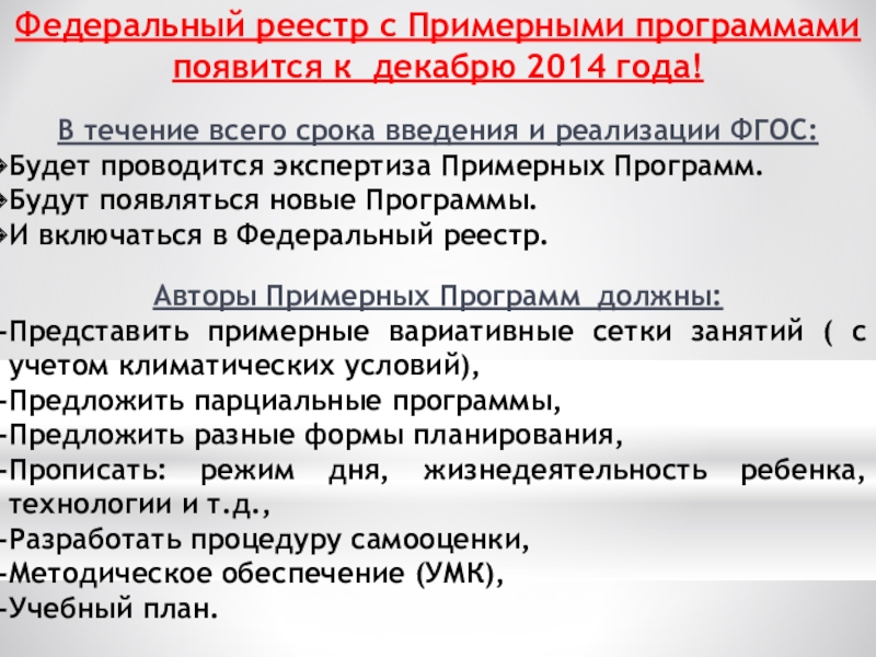 ДОО будут самостоятельно разрабатывать и утверждать свои ООП ДО на основе ФГОС ДО с учетом Примерных Программ;