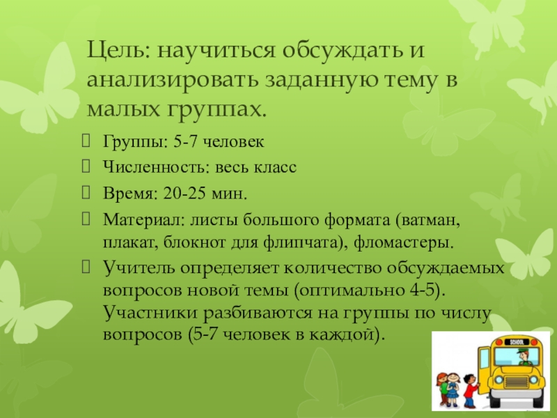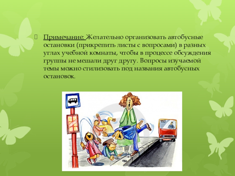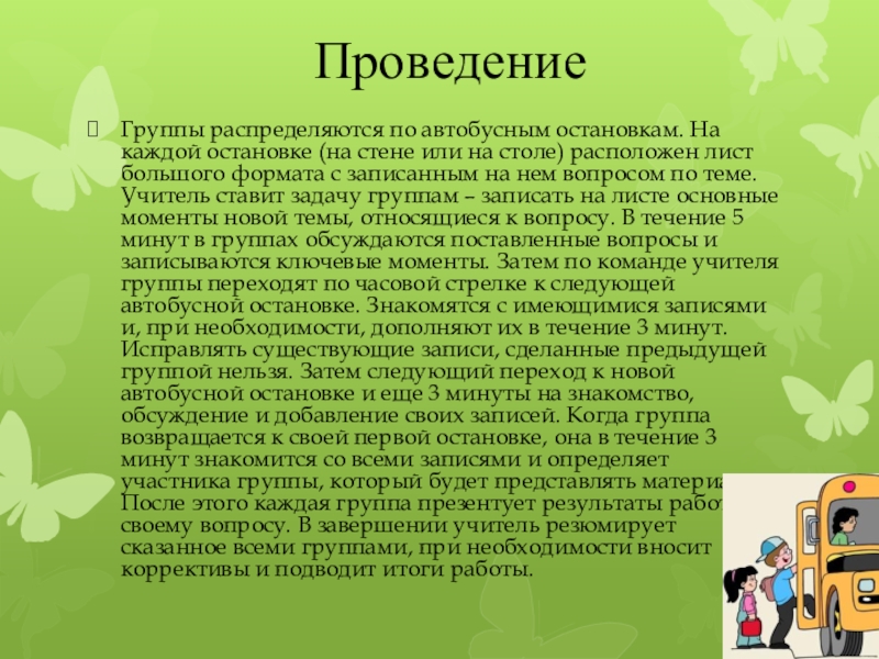 на столе) расположен лист большого формата с записанным на нем вопросом по теме. Учитель ставит задачу группам – записать на листе основные моменты новой темы, относящиеся к вопросу. В течение 5 минут в группах обсуждаются поставленные вопросы и записываются ключевые моменты. Затем по команде учителя группы переходят по часовой стрелке к следующей автобусной остановке. Знакомятся с имеющимися записями и, при необходимости, дополняют их в течение 3 минут. Исправлять существующие записи, сделанные предыдущей группой нельзя. Затем следующий переход к новой автобусной остановке и еще 3 минуты на знакомство, обсуждение и добавление своих записей. Когда группа возвращается к своей первой остановке, она в течение 3 минут знакомится со всеми записями и определяет участника группы, который будет представлять материал. После этого каждая группа презентует результаты работы по своему вопросу. В завершении учитель резюмирует сказанное всеми группами, при необходимости вносит коррективы и подводит итоги работы.