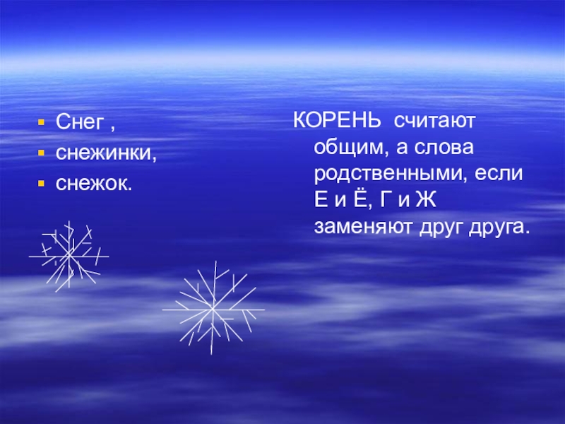 Снег ,снежинки,снежок. КОРЕНЬ считают общим, а слова родственными, если Е и Ё, Г и Ж заменяют друг