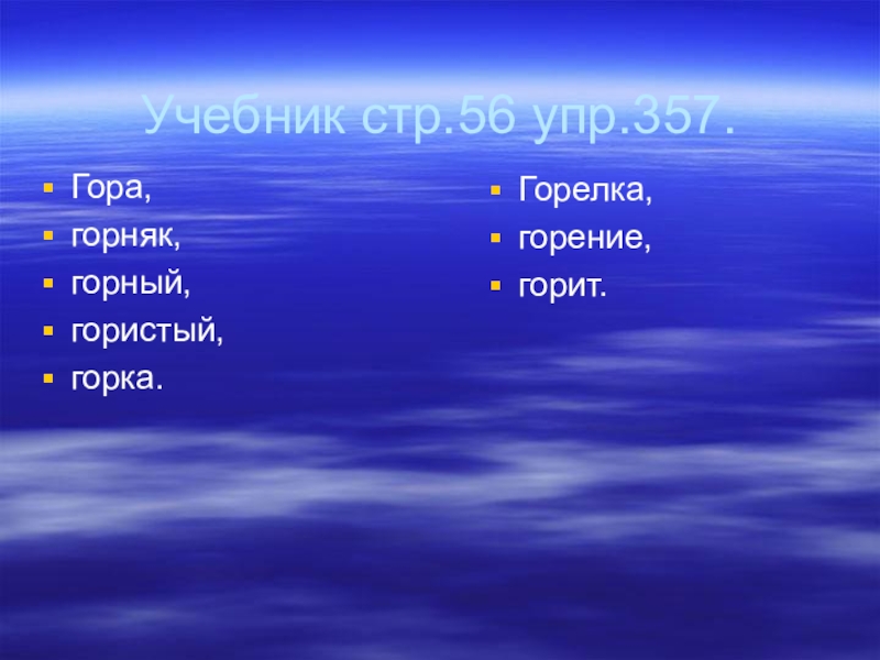 Учебник стр.56 упр.357.Гора, горняк,горный,гористый,горка.Горелка,горение,горит.