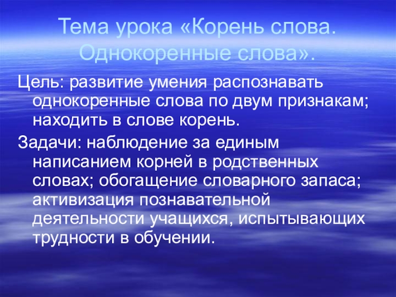 Тема урока «Корень слова. Однокоренные слова».Цель: развитие умения распознавать однокоренные слова по двум признакам; находить в слове корень.Задачи: наблюдение за единым написанием корней в родственных словах; обогащение словарного запаса; активизация познавательной деятельности учащихся, испытывающих трудности в