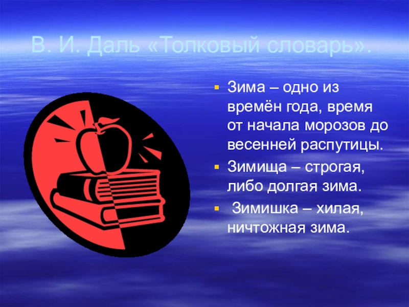 В. И. Даль «Толковый словарь».Зима – одно из времён года, время от начала морозов до весенней распутицы.Зимища