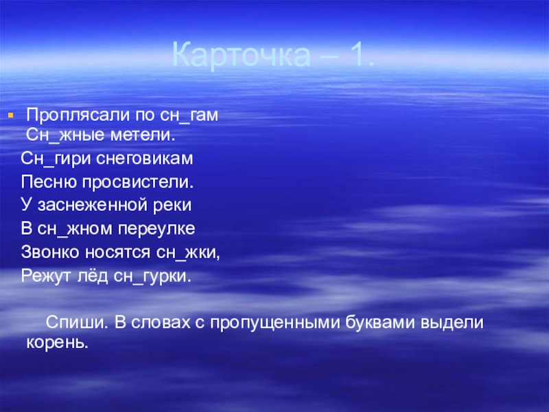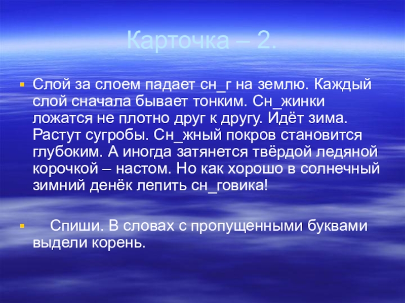 Карточка – 2.Слой за слоем падает сн_г на землю. Каждый слой сначала бывает тонким. Сн_жинки ложатся не