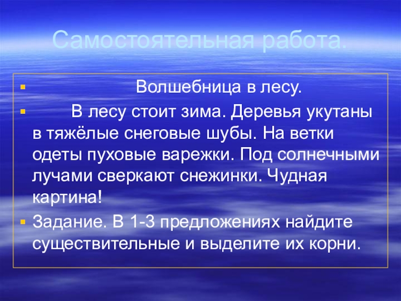 Задание. В 1-3 предложениях найдите существительные и выделите их корни.