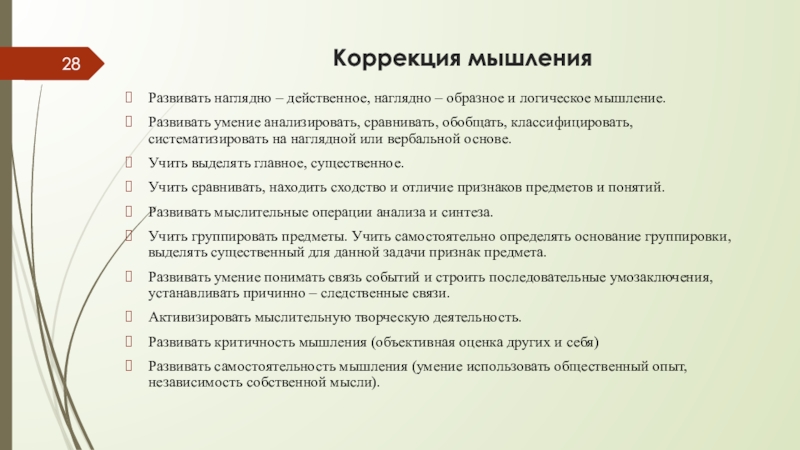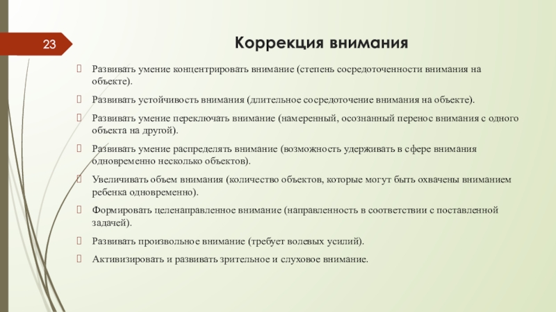 низкая степень устойчивости внимания, поэтому необходимо специально организовывать и направлять внимание детей. Полезны все упражнения, развивающие все формы внимания.