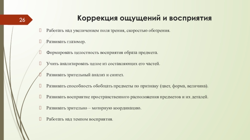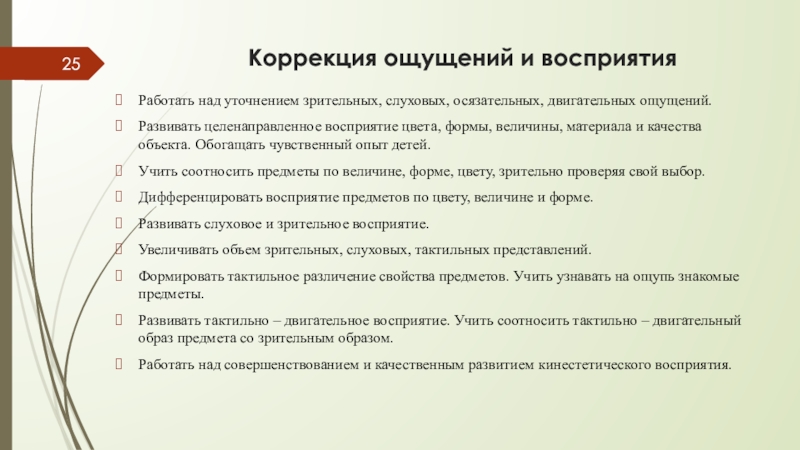 Работать над уточнением зрительных, слуховых, осязательных, двигательных ощущений.
