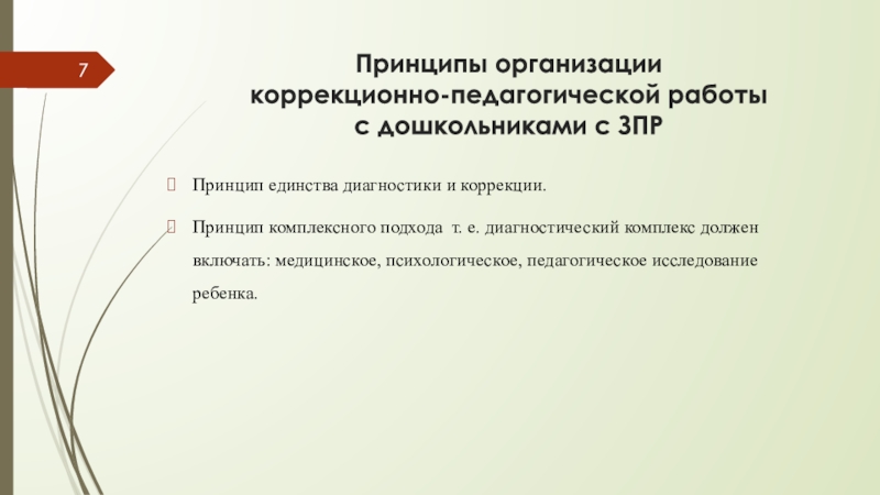 Принцип комплексного подхода т. е. диагностический комплекс должен включать: медицинское, психологическое, педагогическое исследование ребенка.